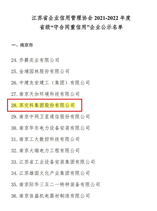 近日,江苏省企业信用管理协会公布了2021-2022年度省级“守合同重信用”企业名单,苏交科集团凭借完善的诚信体系建设顺利通过省级信用评价,荣获该项称号。 诚信经营是企业生存发展的基本准则。未来,苏交科将继续坚持“诚信服务”的理念,严格遵守国...